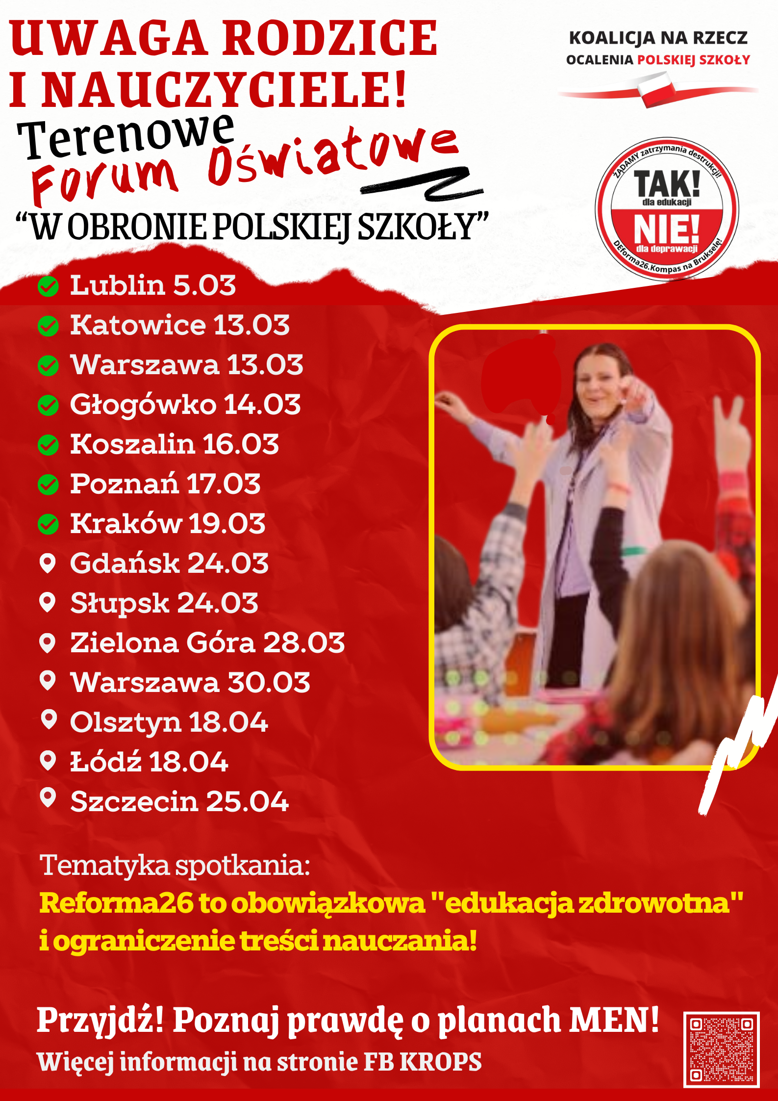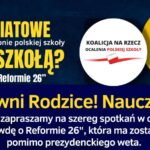 Zapraszamy na TERENOWE FORA OŚWIATOWE, które odbywają się w wielu polskich miastach. Zaproś znajomych – daj szansę na zapoznanie się z destrukcyjnym przekazem „Reformy 2026”, która ma zostać wdrożona do polskich szkół mimo sprzeciwu tysięcy Polaków oraz Prezydenta.