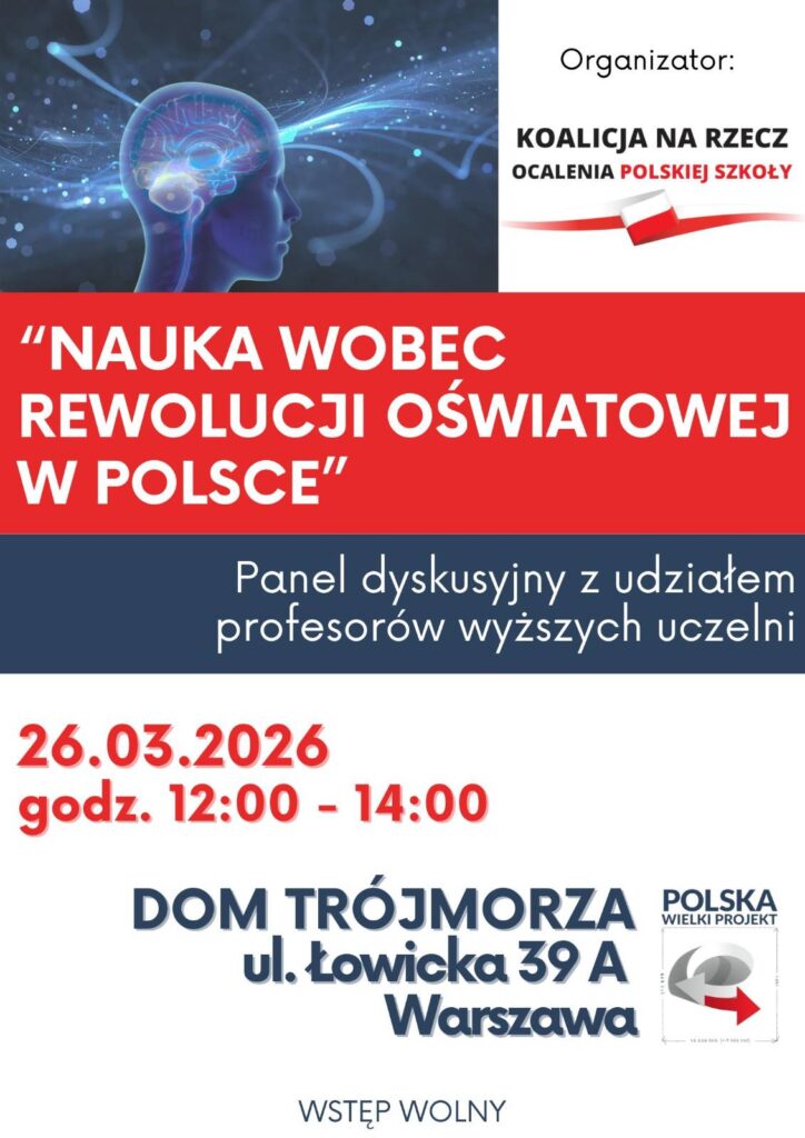 W imieniu Koalicji na Rzecz Ocalenia Polskiej Szkoły skupiającej 94 organizacje społeczne oraz Fundacji Polska Wielki Projekt zapraszamy na panel dyskusyjny pod nazwą NAUKA WOBEC REWOLUCJI OŚWIATOWEJ W POLSCE. Wydarzenie będzie miało miejsce 26.03 br. w godz. 12-14.00 w Warszawie, w Domu Trójmorza, ul. Łowicka 39A. Zaproszenie do udziału w…