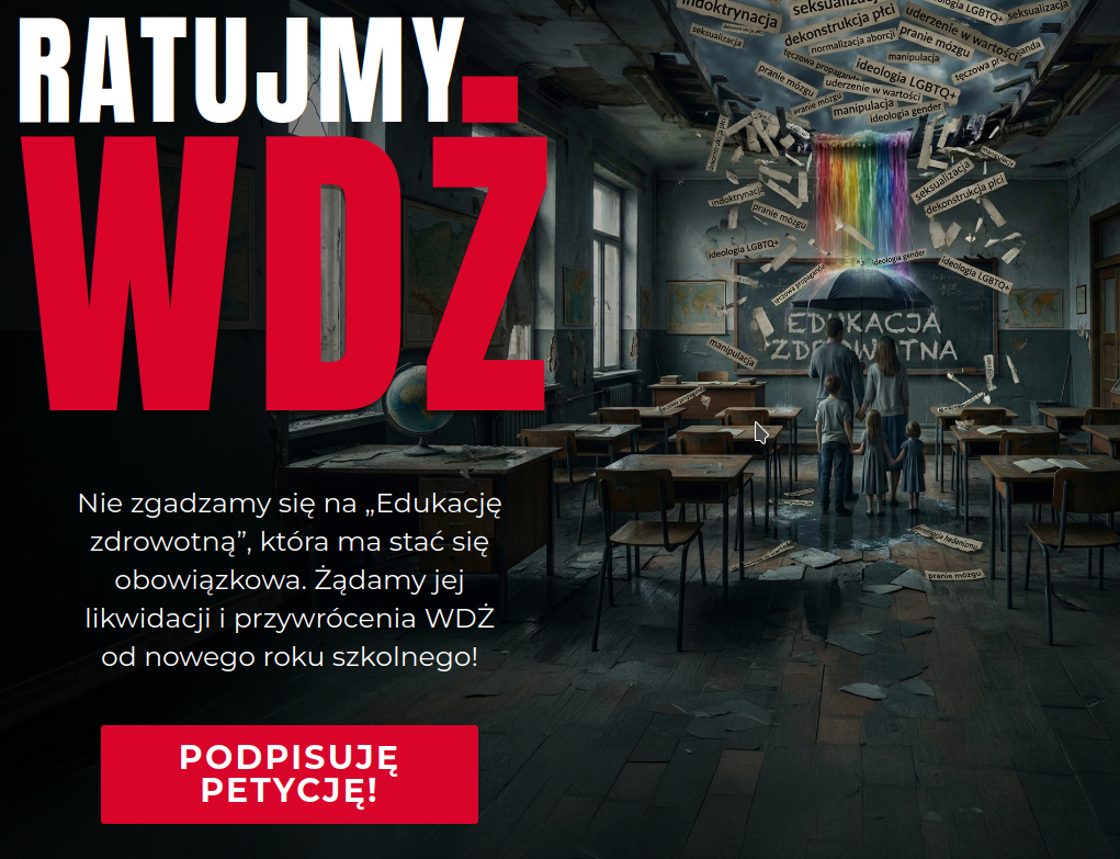 Pragniemy ocalić szkołę, która jest oparta na klasycznych wartościach, kształtuje cnoty, uznaje osadzone w polskiej kulturze wzorce postaw, m. in. tradycyjny model rodziny; wychowuje w duchu umiłowania Ojczyzny – Polski, dba o wysoki poziom kształcenia; jest autonomiczna, niezależna od wpływów międzynarodowych organizacji, nie podlega pod zarządzanie unijne według projektowanego przez UE Europejskiego Obszaru Edukacyjnego oraz pod agendy ONZ.