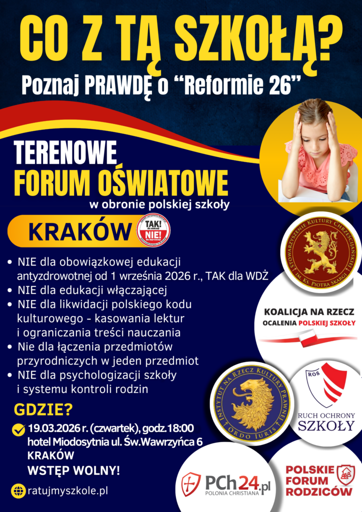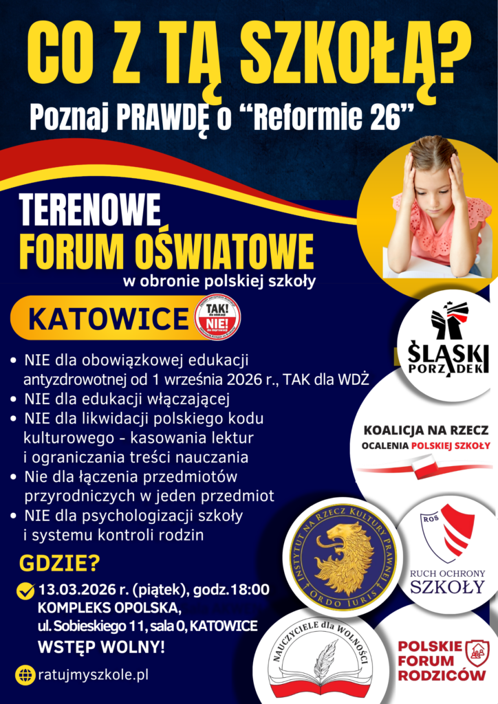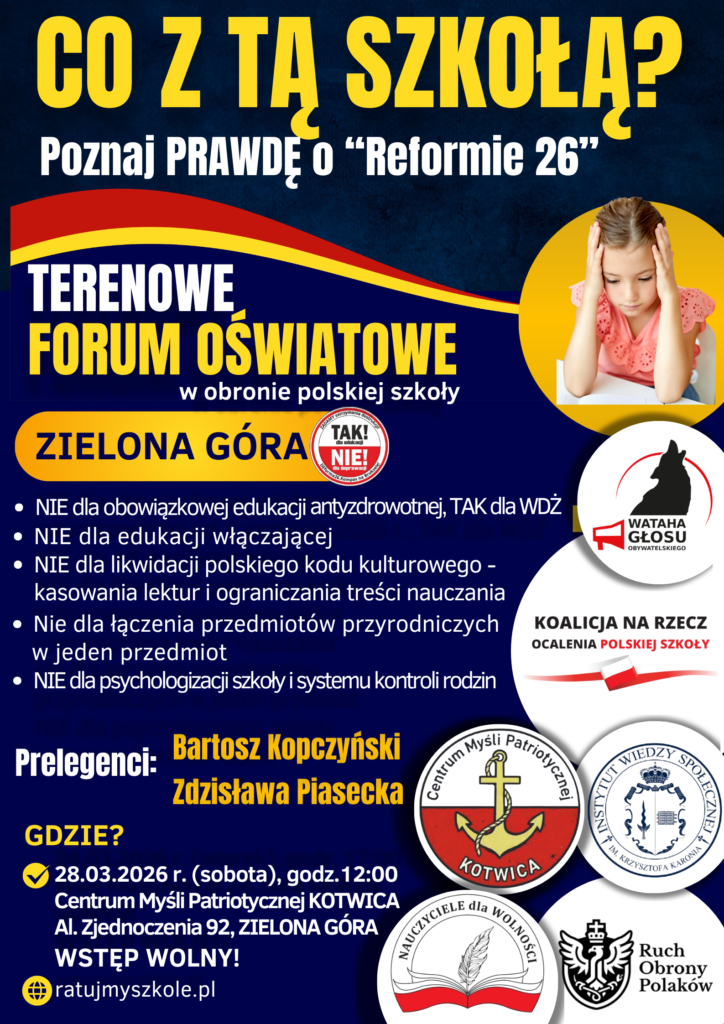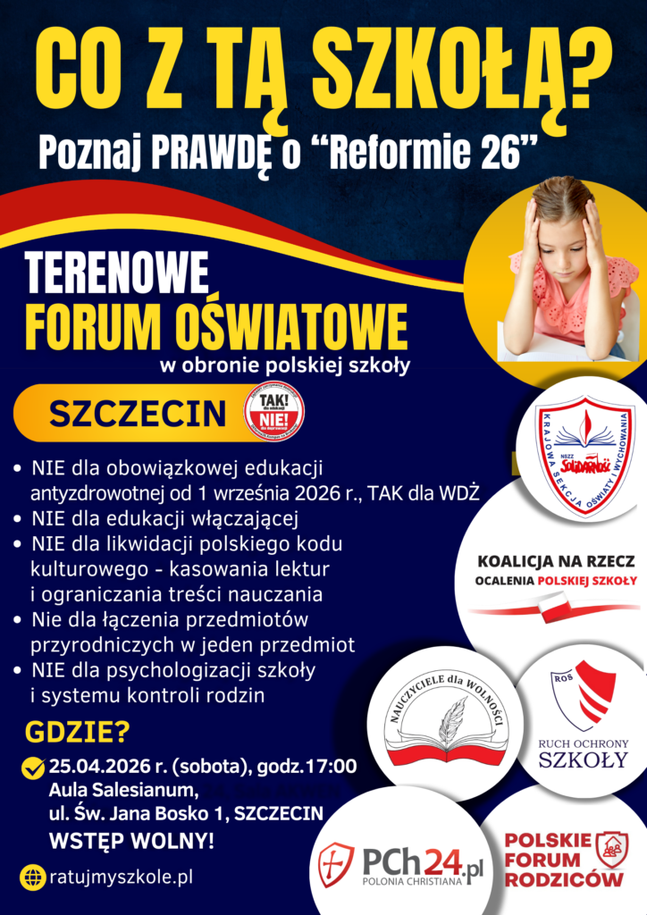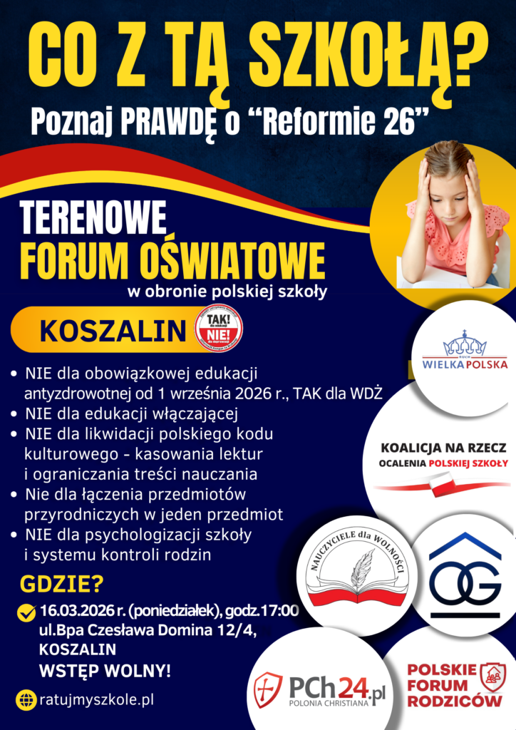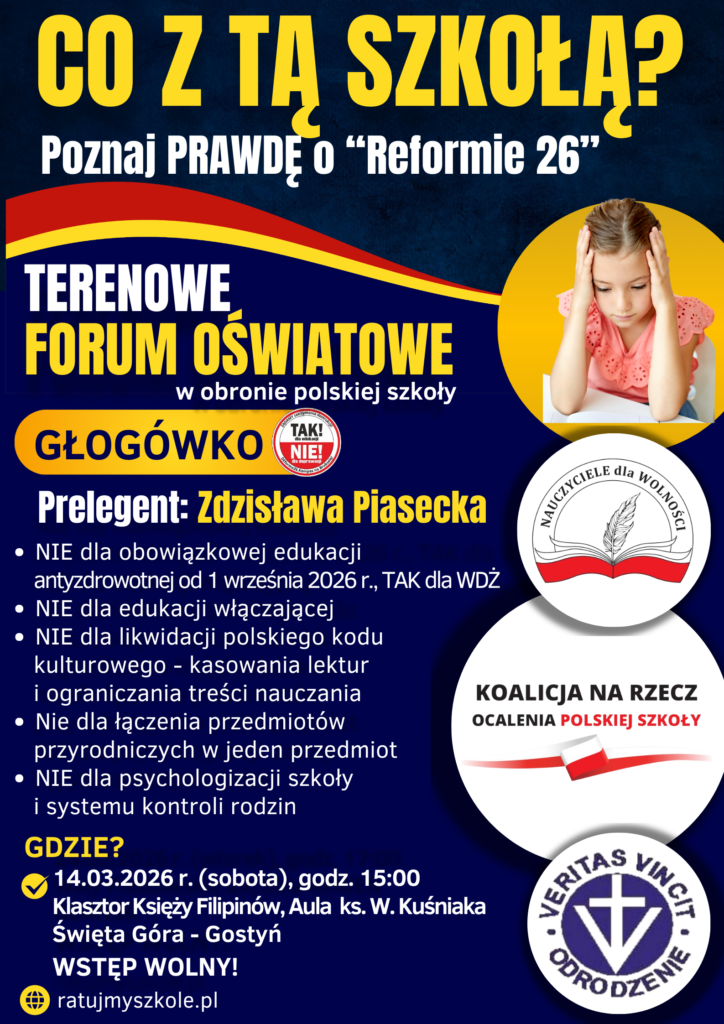 W OBRONIE POLSKIEJ SZKOŁY Poznaj prawdę o planach MEN i „Reformie 26” W dniu 24 marca 2026 r., odbędzie się w Gdańsku Terenowe Forum Oświatowe: „W Obronie Polskiej Szkoły”. (wtorek, godz. 17.00, siedziba NSZZ „Solidarność” w Gdańsku, ul. Wały Piastowskie 24, sala AKWEN). Konferencję organizuje: Koalicja na Rzecz Ocalenia Polskiej…