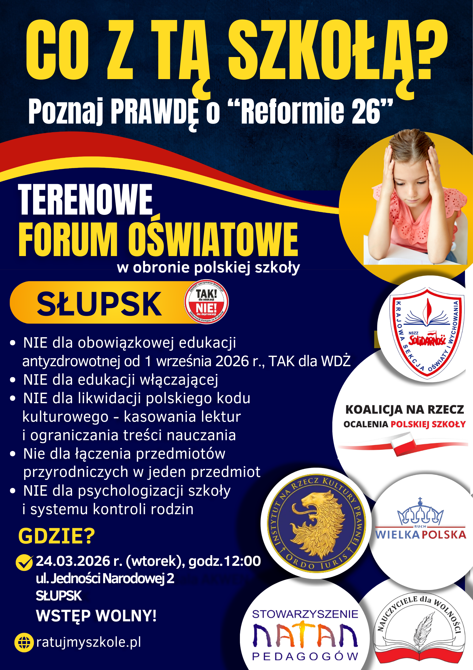 W OBRONIE POLSKIEJ SZKOŁY Poznaj prawdę o planach MEN i „Reformie 26” W dniu 24 marca 2026 r., odbędzie się w Gdańsku Terenowe Forum Oświatowe: „W Obronie Polskiej Szkoły”. (wtorek, godz. 17.00, siedziba NSZZ „Solidarność” w Gdańsku, ul. Wały Piastowskie 24, sala AKWEN). Konferencję organizuje: Koalicja na Rzecz Ocalenia Polskiej…