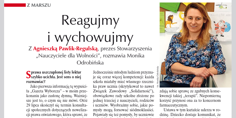 Zachęcamy do przeczytania dwuczęściowego wywiadu, którego udzieliła Hanna Dobrowolska portalowi Strefa edukacji, omawiając po kolei większość pseudoreform MEN, m.in. rugowanie religii, wprowadzenie edulacji zdrowotnej, nowelizację prawa oświatowego: Cześć 1: Celem zmian jest odebranie Polsce suwerenności w zakresie oświaty – mówi Hanna Dobrowolska, ekspertka oświatowa i publicystka. Jej zdaniem to, co dzieje się dziś w polskich