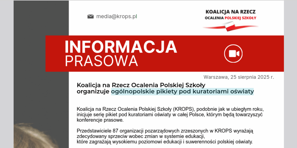 Pikieta pod Łódzkim Kuratorium Oświaty organizowana przez Stowarzyszenie Nauczycieli i Pracowników Oświaty „Nauczyciele dla Wolności” w dniu 26 sierpnia 2025 r. o godz. 12.00 zapoczątkowała tegoroczną akcję pikiet pod kuratoriami oświaty w większości dużych miast w Polsce – akcję inicjowaną przez Koalicję na Rzecz Ocalenia Polskiej Szkoły. Koordynatorem wydarzenia była Renata Janik, w pikiecie aktywny […]