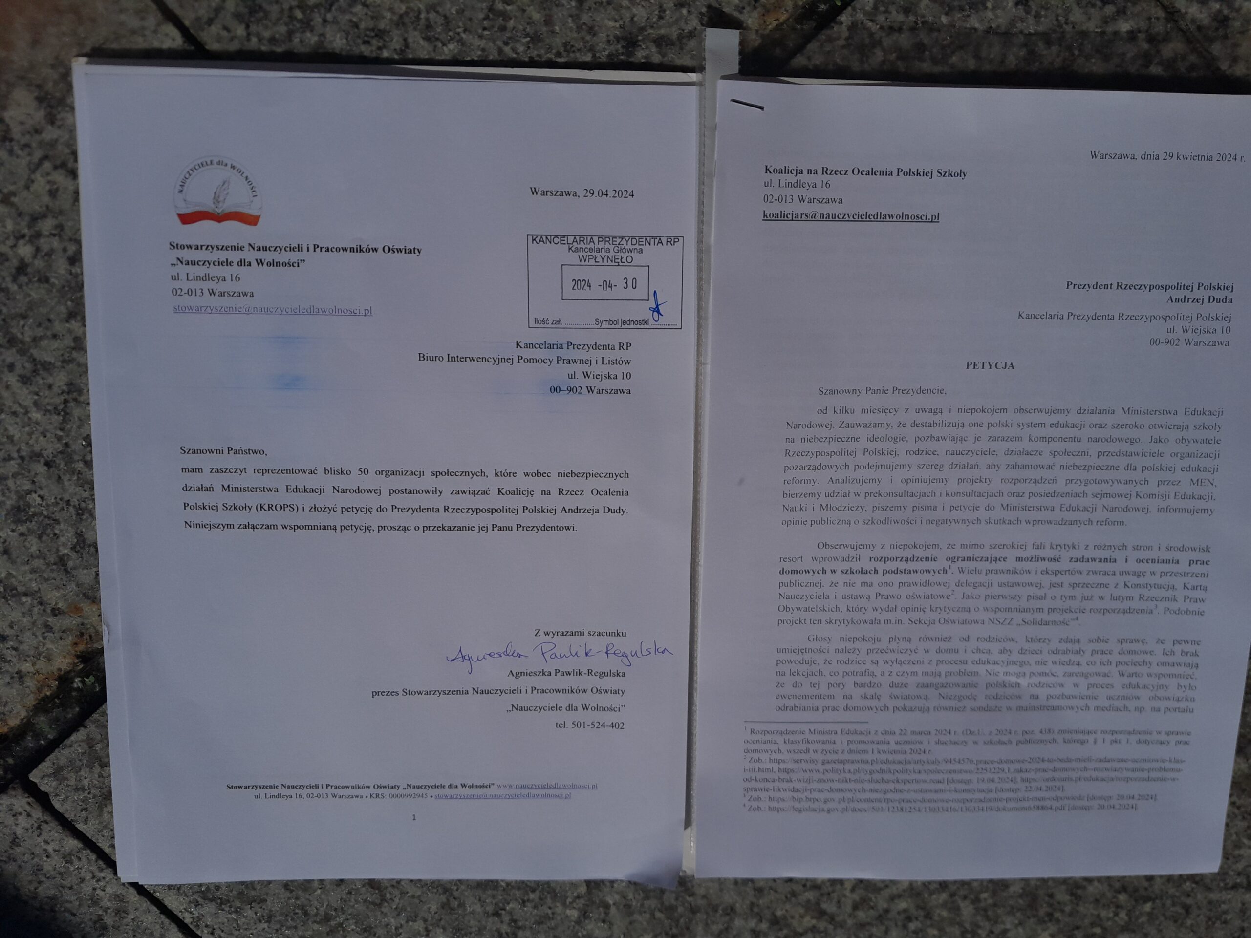 Mimo krytyki z bardzo różnych stron (ze strony Rzecznika Praw Obywatelskich, związków zawodowych, nauczycieli i rodziców) MEN 1.04.2024 wprowadził zakaz zadawania obowiązkowych prac domowych w szkole podstawowej. Ten absurdalny, łamiący kilka ustaw wyższego rzędu przepis można jedynie poddać weryfikacji poprzez złożenie wniosku do Trybunału Konstytucyjnego z prośbą o zbadanie jego zgodności z Konstytucją, Kartą Nauczyciela czy prawem oświatowym. Jako nowo powstała Koalicja na Rzecz Ocalenia Polskiej Szkoły zwróciliśmy się do prezydenta RP z apelem o złożenie takiego wniosku.