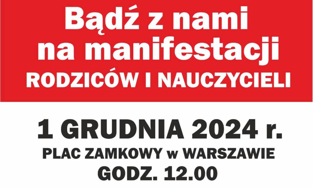 Zapraszamy na wielką manifestację rodziców, nauczycieli, młodzieży, wszystkich, którym zależy na dobru polskich uczniów i którzy chcą wyrazić sprzeciw wobec tego, jak niszczy szkołę min. Nowacka. KIEDY: 1.12.2024 godz. 12.00 GDZIE: pl. Zamkowy w Warszawie ORGANIZATOR: Koalicja na Rzecz Ocalenia Polskiej Szkoły Przyjdź, przyjedź, zaprotestuj: Chcemy dobrej szkoły, opartej na tradycyjnych wartości, uczącej umiłowania Ojczyzny i pracy nad […]