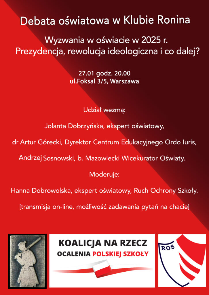 27 stycznia 2025 w Klubie Ronina odbyła się debata oświatowa współorganizowana przez Klub Ronina i Ruch Ochrony Szkoły pod egidą KROPS – „Wyzwania w oświacie w 2025 r. Prezydencja, rewolucja ideologiczna i co dalej?”.
