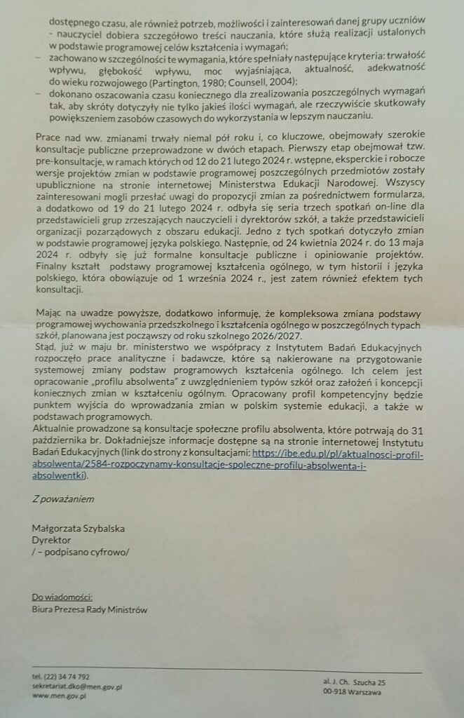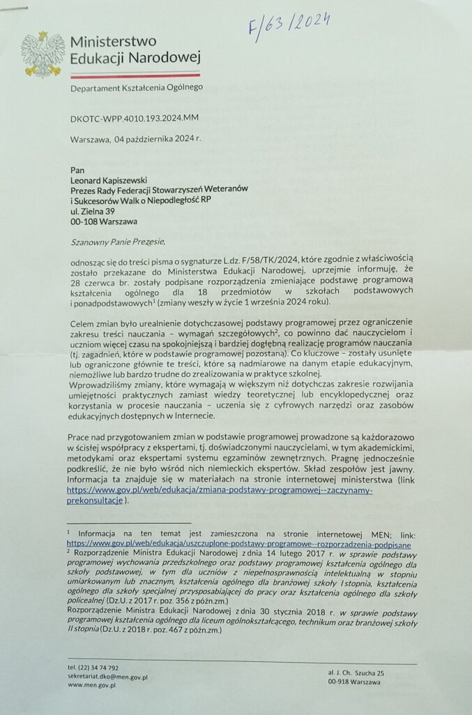 Z przykrością należy stwierdzić, że premier czuł się jedynie w obowiązku przesłać pismo do MEN, które zostało zobowiązane do odpowiedzi. Odczytujemy to jako jawne lekceważenie pozostałych jeszcze przy życiu bojowników o wolność naszej Ojczyzny i ich spadkobierców.