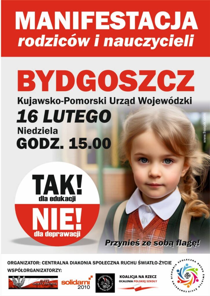 16.02 o godzinie 15:00 przed Urzędem Wojewódzkim w Bydgoszczy odbyła się manifestacja rodziców, nauczycieli oraz wszystkich, którym zależy na dobru dzieci i młodzieży. Pod hasłem Tak dla edukacji! Nie dla deprawacji! – mimo mroźnej pogody – zgromadziło się około 100 manifestantów, w tym całe rodziny z dziećmi.
