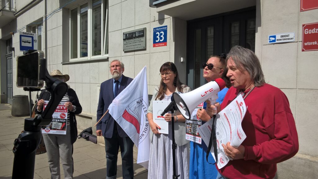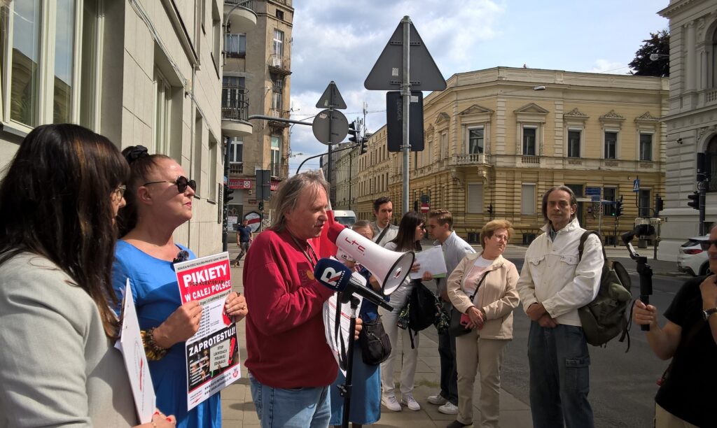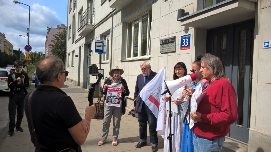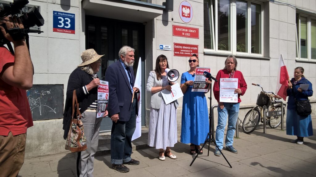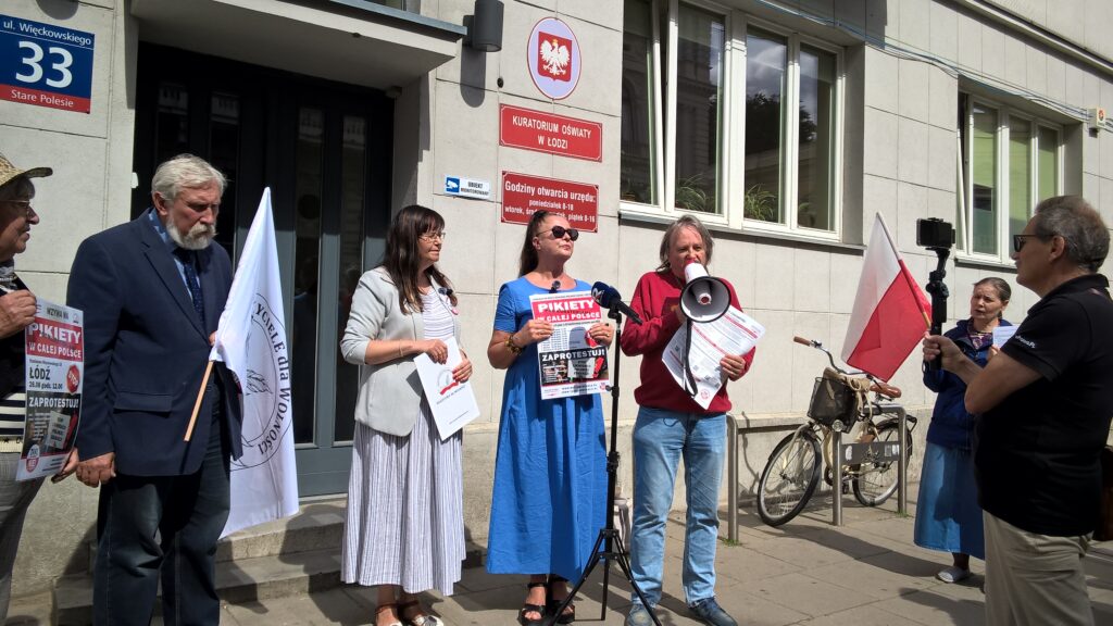 Pikieta pod Łódzkim Kuratorium Oświaty organizowana przez Stowarzyszenie Nauczycieli i Pracowników Oświaty „Nauczyciele dla Wolności” w dniu 26 sierpnia 2025 r. o godz. 12.00 zapoczątkowała tegoroczną akcję pikiet pod kuratoriami oświaty w większości dużych miast w Polsce – akcję inicjowaną przez Koalicję na Rzecz Ocalenia Polskiej Szkoły. Koordynatorem wydarzenia była Renata Janik, w pikiecie aktywny udział wzięła Jadwiga Materska z SNDW Nieocenioną pomoc organizacyjną przyniosły również osoby z łódzkiego środowiska wolnościowego za co dziękujemy. W tym roku Łódź dołączyła do grona miast organizujących pikiety i właśnie tu – w centrum Polski, w sercu naszego kraju, rozpoczęliśmy prezentowanie naszych postulatów.